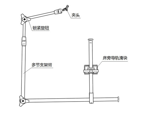扩肛器支架和内窥镜支架,与手术床旁导轨连接锁定,可任意调节位置和角度 3. 型号规格 型号:XJ-29-19; 规格:KGQ30、KGQ40、KGQ50、KGQ60、KGQ70; 规格说明:数字代号分别表示螺纹套管旋入段长度(mm)。 附件支架型号:XJ-37-19; 支架规格:ZJ-A(螺纹套管支架)、ZJ-B(照明/摄像支架)。
