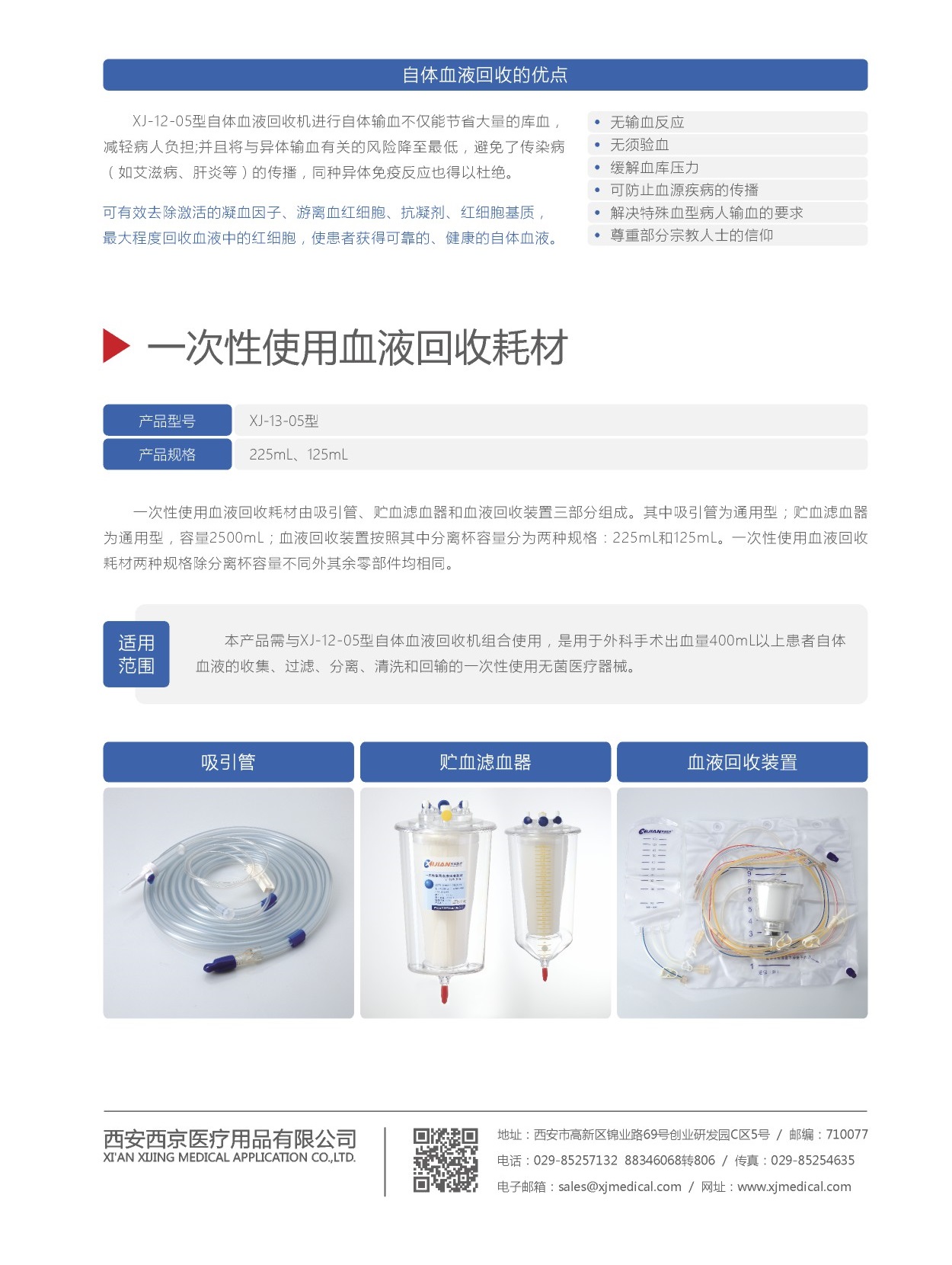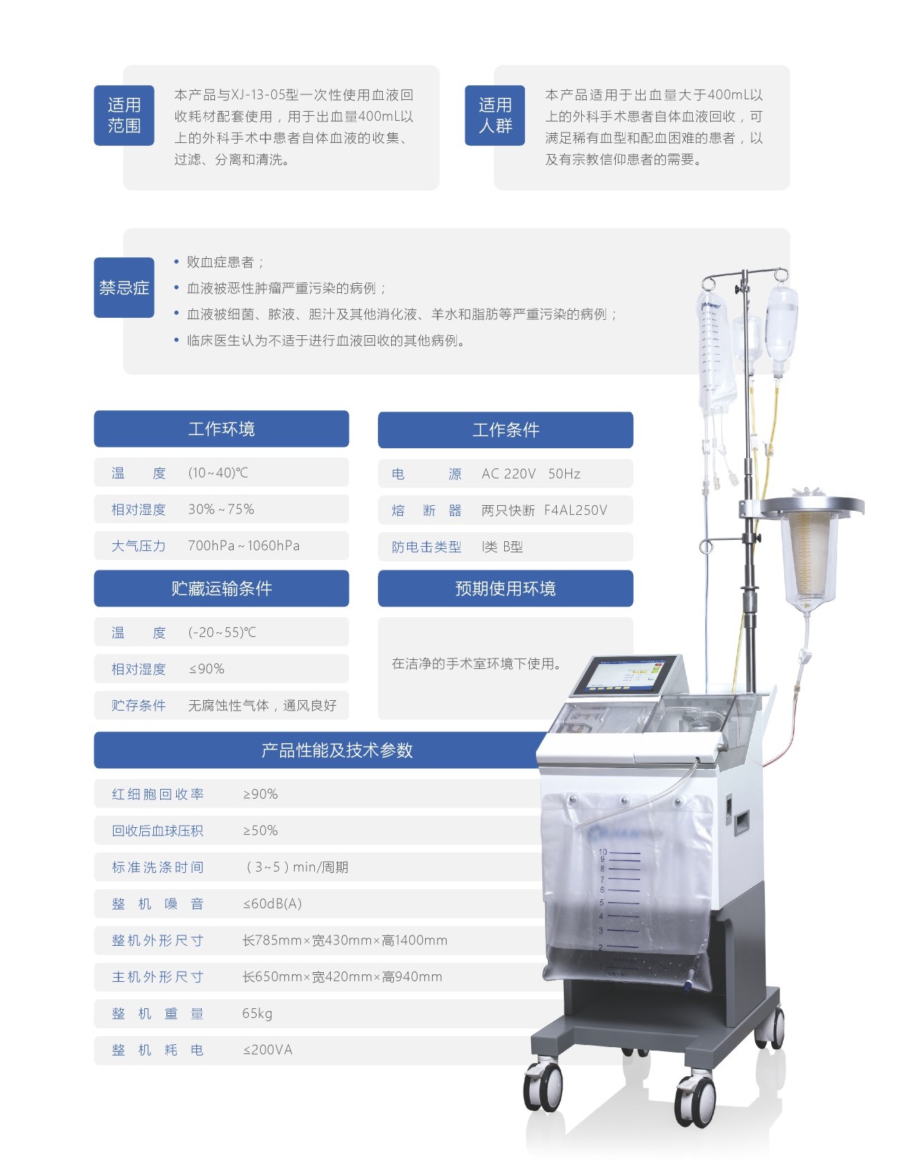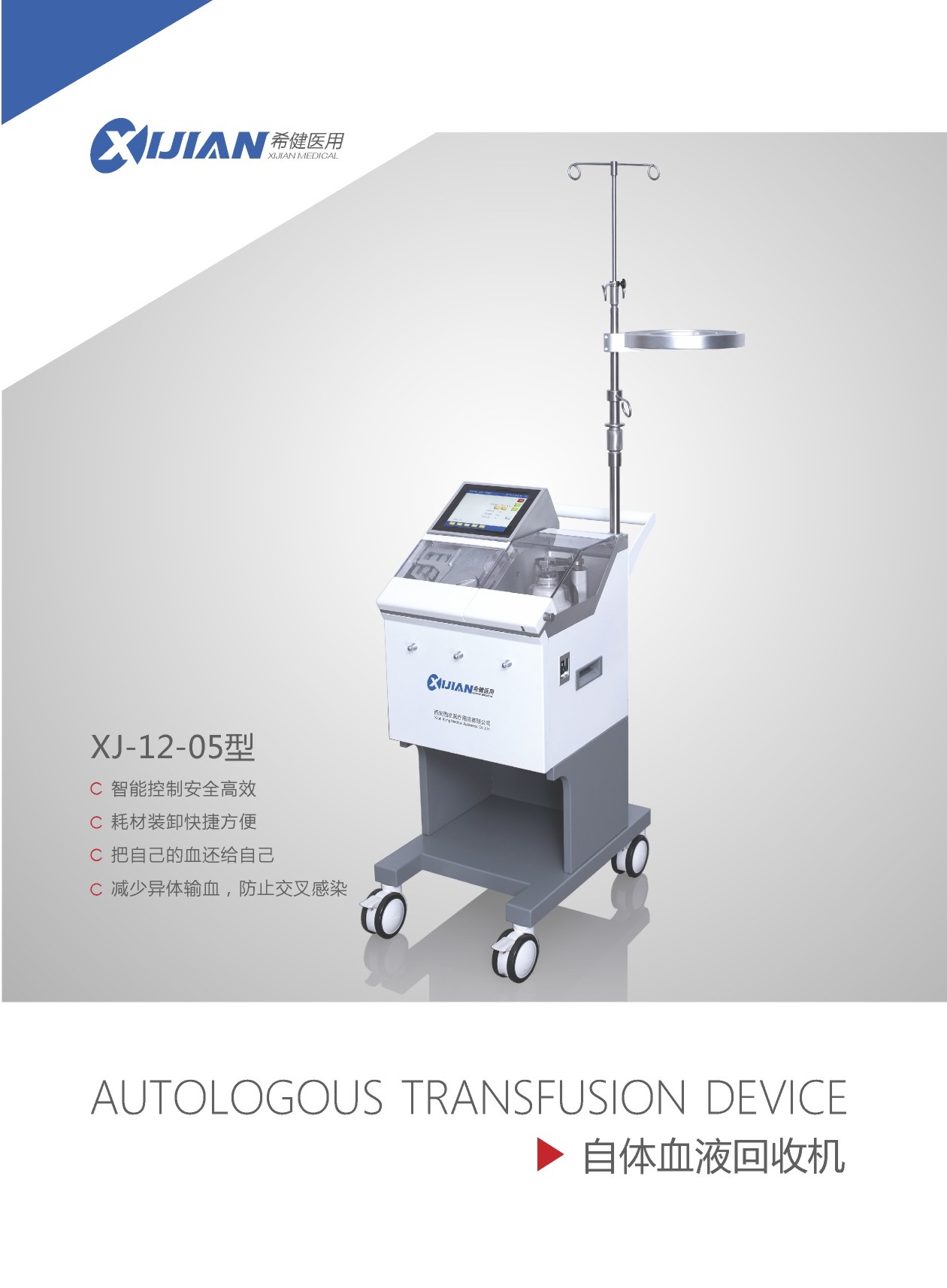 XJ-12-05型自体血液回收机进行自体输血不仅能节省大量的库血,减轻病人负担;而且将与异体输血有关的风险降至最低限,完全避免了传染病(如艾滋病、肝炎等)的传播,同种异体免疫反应也得以完全杜绝: 可防止血源疾病的传播 无输血反应 无须验血 缓解血库压力 解决特殊血型病人输血的要求 尊重部分宗教人士的信仰